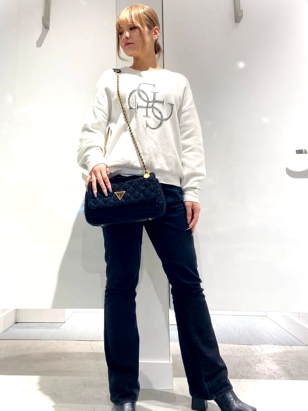 トップスはニット素材で袖がフワッとして手首はキュッとしているのが女性らしさがあって可愛い♡ パンツはフレアになっておりスタイルアップ⤴︎︎︎⤴︎︎︎ ストレッチが程よく効いているので履き心地良いです! バックは光に当たるとキラキラしていてすごく可愛いです✨ 斜めがけも出来ますが大きめなので肩掛けオススメです!!