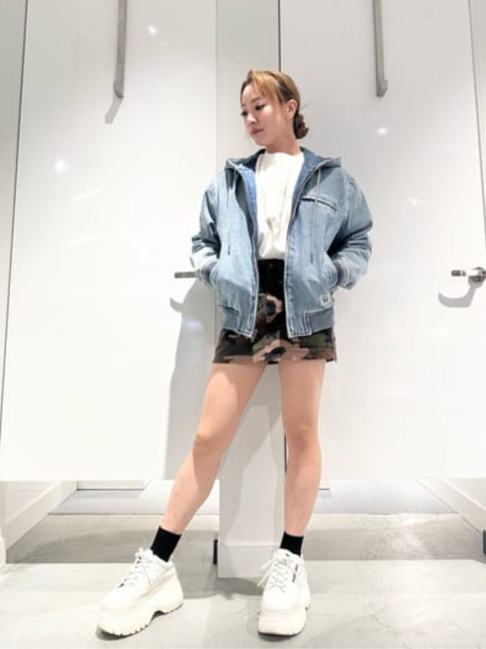 【Tops】Sサイズ着用 オーバーサイズのTシャツ♪ ゆるっと可愛く着れちゃいます♡ 【Outer】Sサイズ着用 オーバーサイズなので肩を落として着ても◎ デニムジャケットなのでどんなコーデにも合わせやすい♡ 【Skirt】 24インチ着用 サイドジップデザインの迷彩スカート♡ シンプルなトップスと合わせるだけでおしゃれ感アップ♥ ミニ丈なのでワンサイズアップで腰履きにして丈感を少し伸ばしても◎お好みでサイズをお選びください♪