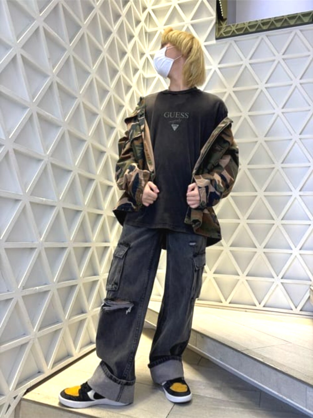 本日はストリートコーデをしてみました! 迷彩柄のジャケットにダメージ加工のある カーゴデニムを合わせることでミリタリー感 が出て凄くかっこいい雰囲気を出すことが出来ます! また、トップスをTシャツにすることで春先からお出かけに負担がかからなくなるのでオススメです!!