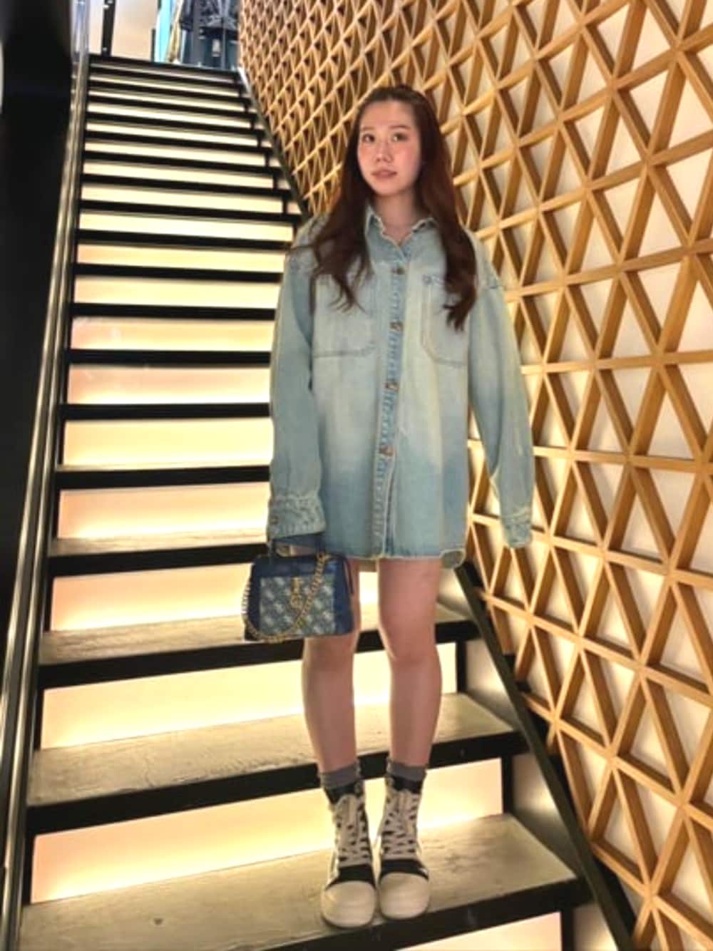 デニムシャツにデニムのバッグで春コーデ 大きめのデニムシャツはワンピースでカジュアルに!!