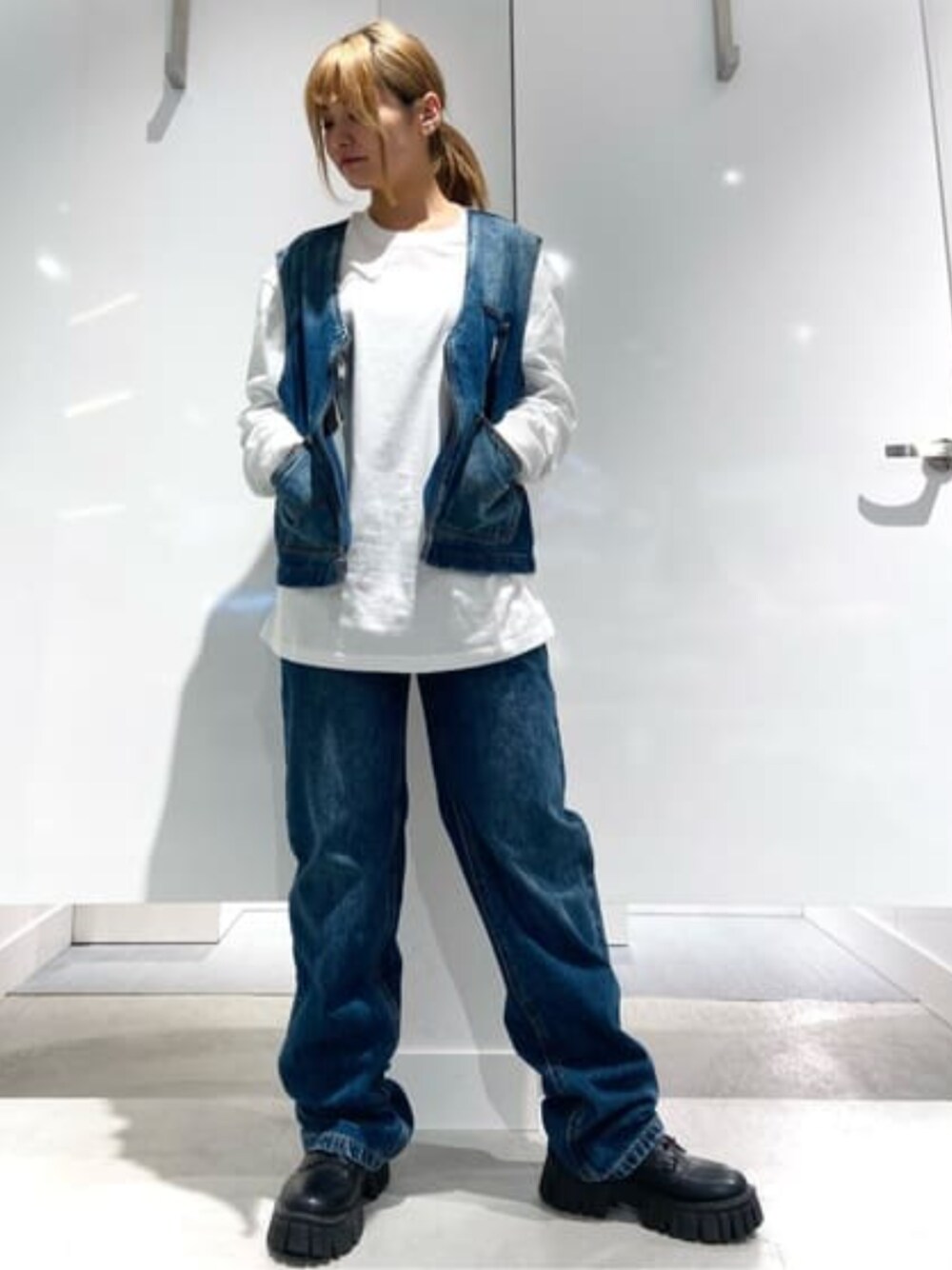 デニムセットアップコーデです✨ ヴィンテージ感のあるデニムなので何にでも合わせられてすごい可愛い♡ デニムベストは大っきいポッケが付いているのでデザインも可愛いし携帯などもすっぽり入ります! デニムはストレートでゆとりがあるのでイマドキ風ですねっ!!