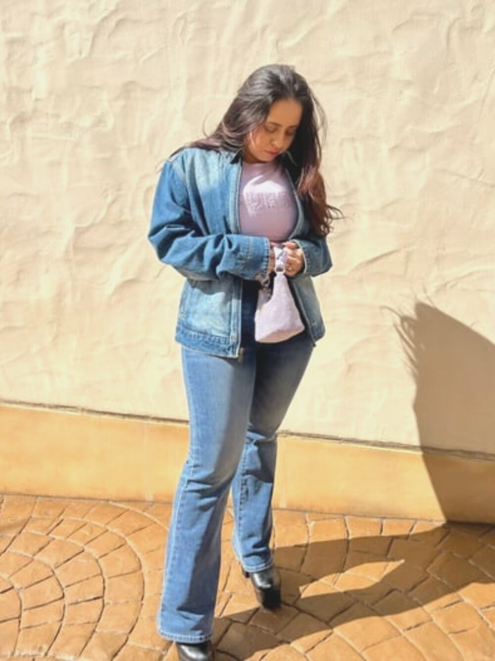 好きな色はパープルです☆コーデ‼︎ キラキラは欠かせないので Tシャツもバッグもキラキラアイテムをチョイス◎ 年中無休で目立っちゃおう☆