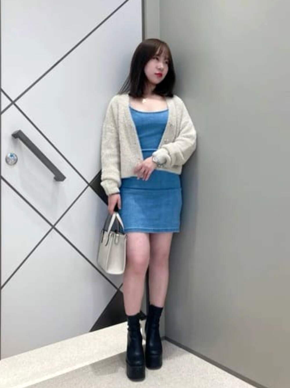 カーディガンとドレス両方とも丈は短いので脚長効果があります! カーディガンのボタンは今季トレンドのリボン型になっていて、とても可愛いデザインになってます! デニムドレスはキャミソールタイプで生地も薄手なので、夏は単品でも着用できます!