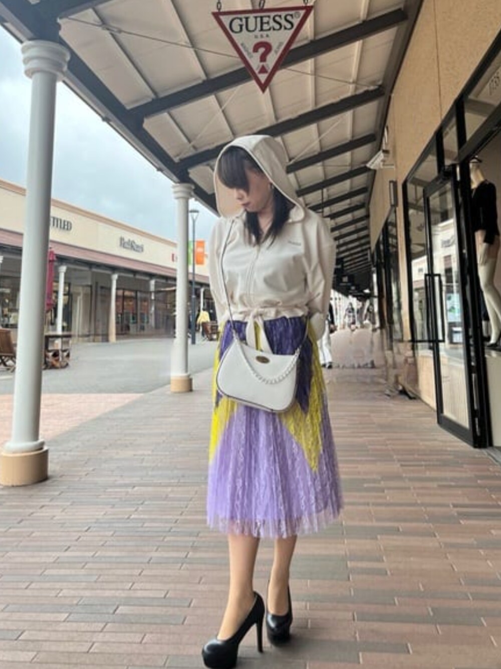 甘めのコーデしてみました笑 トップスはアクティブウェアーのフーディですがウエストにリボンがありショート丈で可愛いです。生地もサラッとしていて着心地◎ しかも60%OFF‼︎ スカートはレースのプリーツスカートで、甘めの印象でも紫と黄色の配色がメリハリを付けてくれます。 ウエストはゴムなのでゆったり着れます♪ バックはショルダーバッグでポイントのカラーチェーンがシンプルの中にも上品さを出してくれるのでカジュアルにもキレイめにも◎