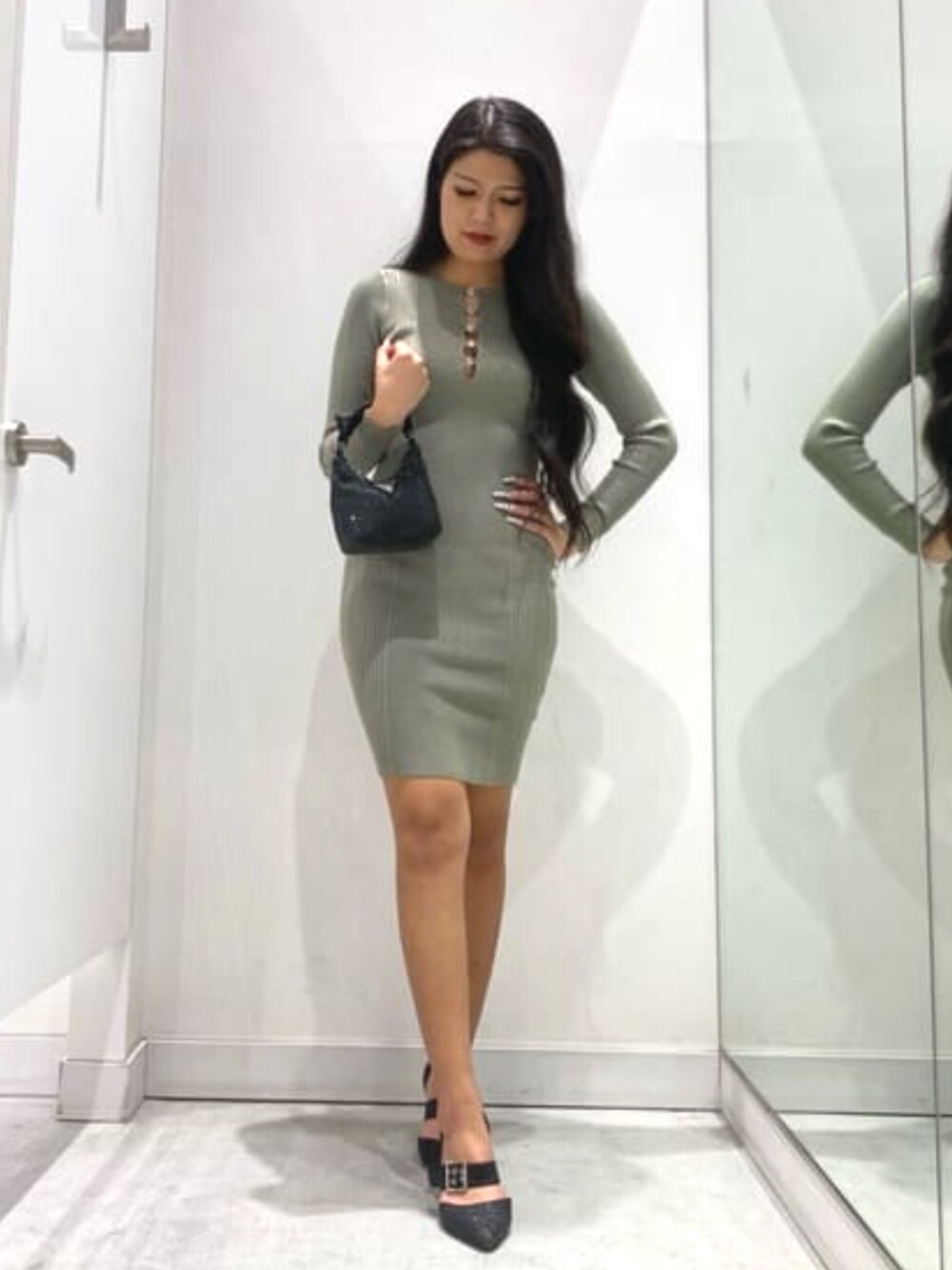 胸元のGUESSロゴのチャームがポイントのドレス!♡ リブニットでストレッチが効いてて着心地バツグンなのにタイトなフィット感でボディラインを綺麗にみせてくれます! 一枚でももちろんかわいいですが中にキャミなど入れて雰囲気を変えるのもオススメです! bagは一押しのラインストーンミニbag! 2wayで使えます!どんなコーデにも主役になり合わせやすい! サイズ ドレス XS