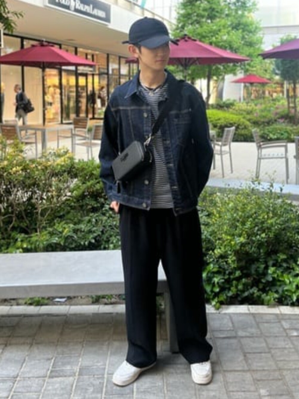 今回は、濃紺のデニムジャケットを使った、 シンプルなコーディネートにしています。 ワントーンにならないよう、ネイビーのボーダー柄のTシャツを入れています!また、ボトムスはタックワイドのスラックスを使って、全体のシルエットを整えました!ぜひ真似してみてください!