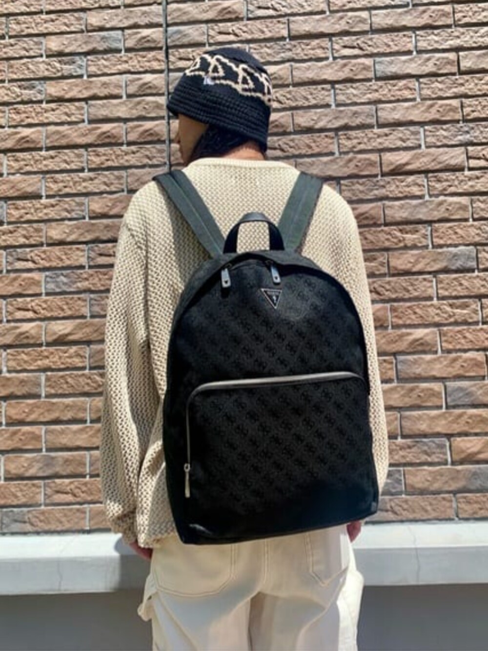 春にピッタリな優しい色味でコーディネート全体を統一しました✴︎ 大胆に編まれたニットは編み目からの肌見えがセクシーポイント⤴︎ 大容量のバックパックはお出かけにピッタリです‼︎