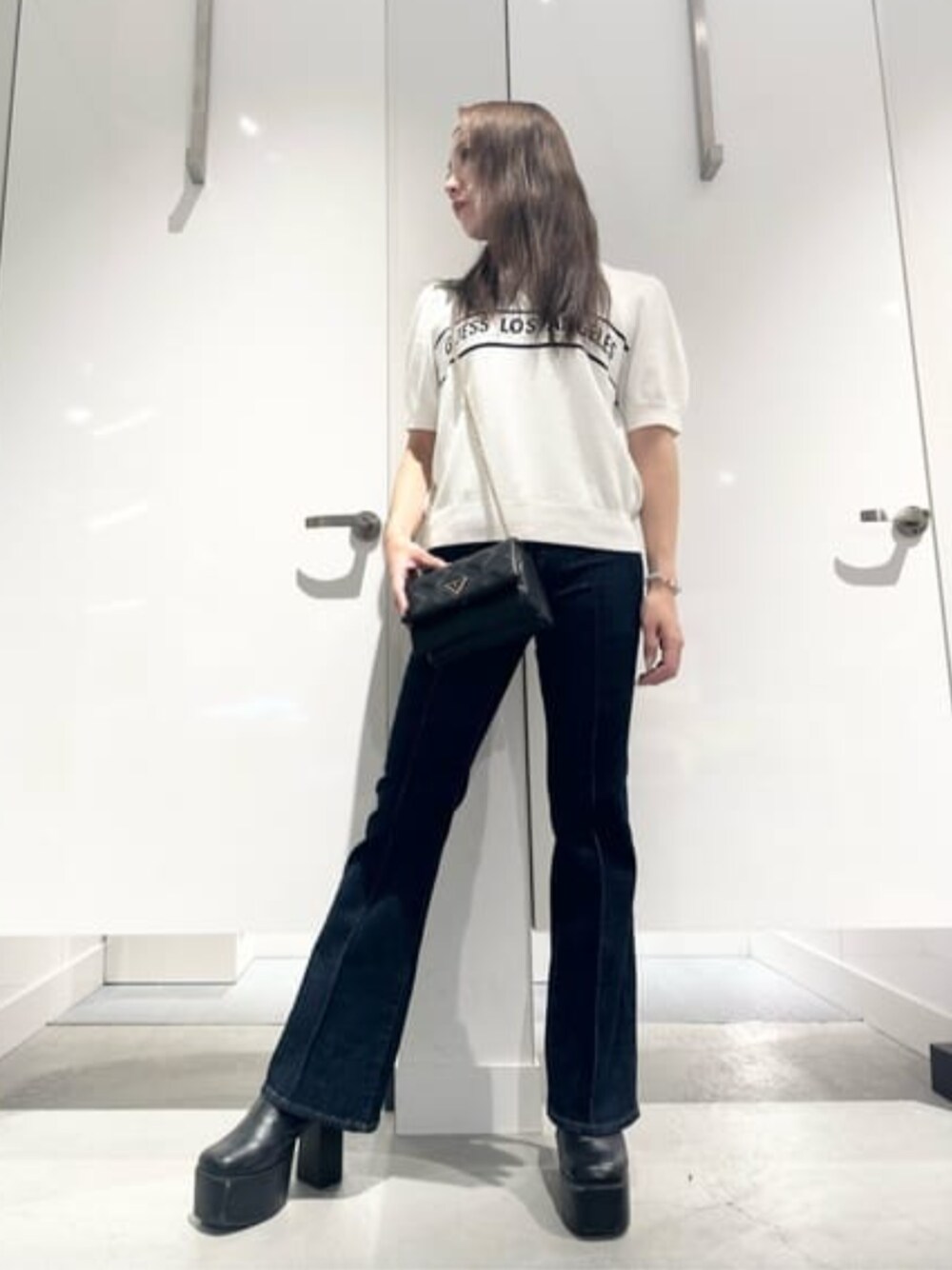 【Tops】Sサイズ着用 今の季節にピッタリの半袖ニット~♡♡ ジャケットのインナーに◎ ネイビーとホワイトの2色♥ 【Denim】24インチ着用 縦ラインの入った足長効果抜群デニム♥ ストレッチも効いていて履きやすさ◎ 【Bag】 ミニキルティングバッグ♪ 大人っぽく演出してくれます~☆