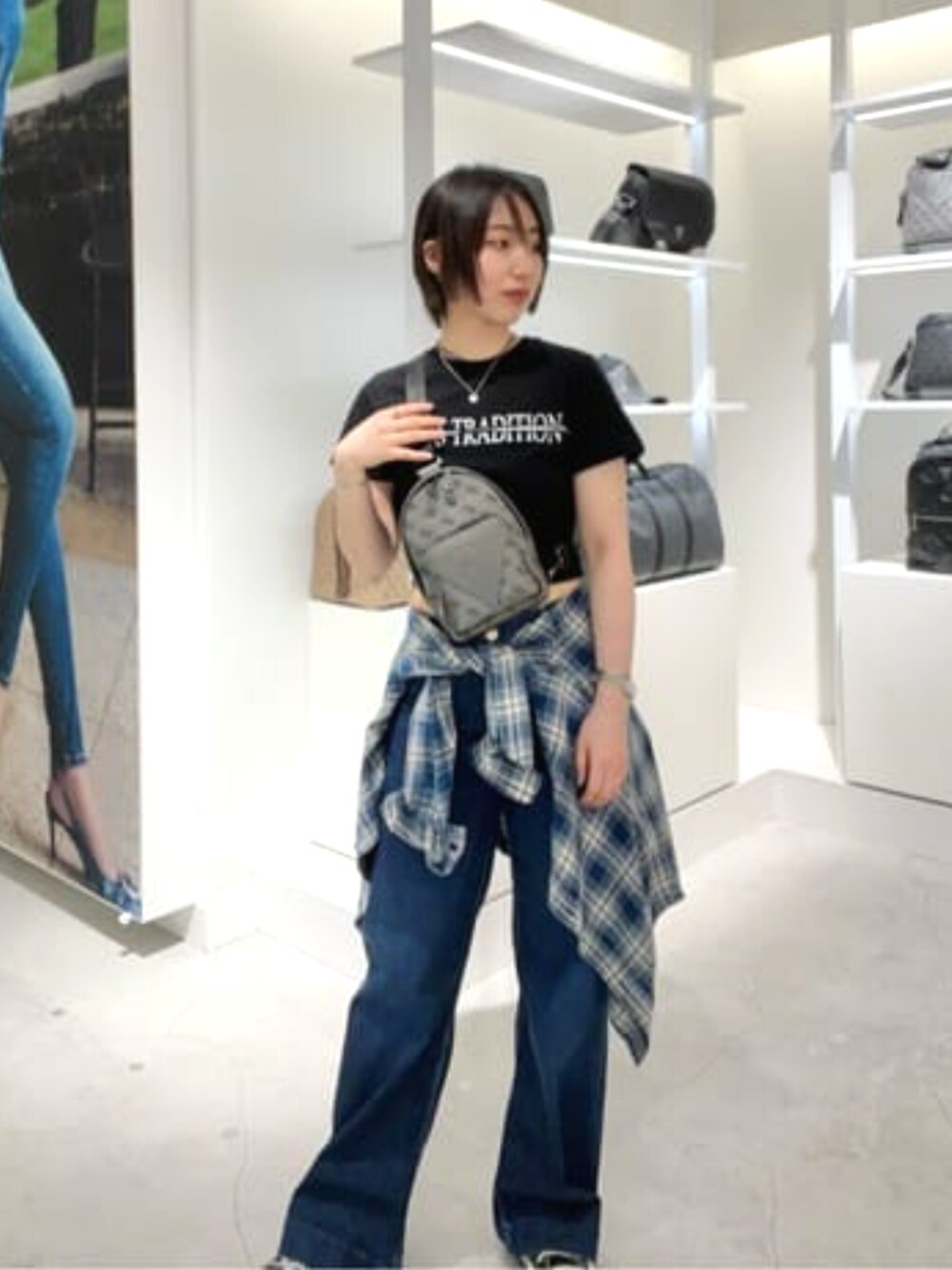 平成のコーディネートをイメージしました!笑 ハンドバッグは、羽田店限定! グレーの光沢感のあるカラーと、小さめの使いやすいボディバックです!! トップスは、短めの丈で、絞って短めにきても可愛いです。デニムと相性抜群です!