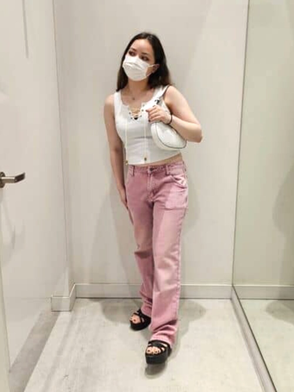 タンクトップの丈が長いのでローライズのデニムなどと合わせるのがオススメです。シンプルなタンクトップなのでデニムと合わせてかわいいシンプルコーデで決まり! デニムはカーペンターで後ろがかわいいです! ピンクのデニムなのでシンプルなトップスと合わせるのがオススメです。いつもよりサイズ大きめに履くのもかわいい! ハンドバッグはシンプルで何でも合わせやすいです。 夏はやっぱり白のバッグ! 2Wayなので斜め掛けもできます。