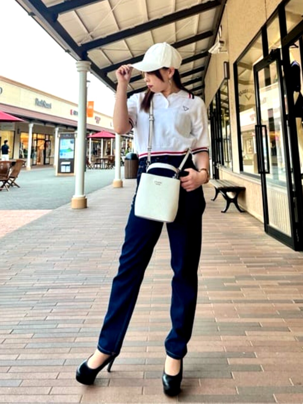 トップスはショート丈ポロで脚長効果+袖も五分なので二の腕隠してくれてます!これ大事! 白地のケーブル編ニットにスポーティなラインがまた爽やかさも演出してくれます デニムはショート丈トップスに合わせハイウエストを選びました!太ももあたりにゆるみと丸みがあり体系カバーもできるし動きやすいです!色味もダークインディゴブルーが白トップスにピッタリです(^^) 爽やかコーデに合う真っ白なバッグを選びました!Gマークが全体に押し型させた丸みのあるシルエットでマチも幅広いので見た目より入ります!