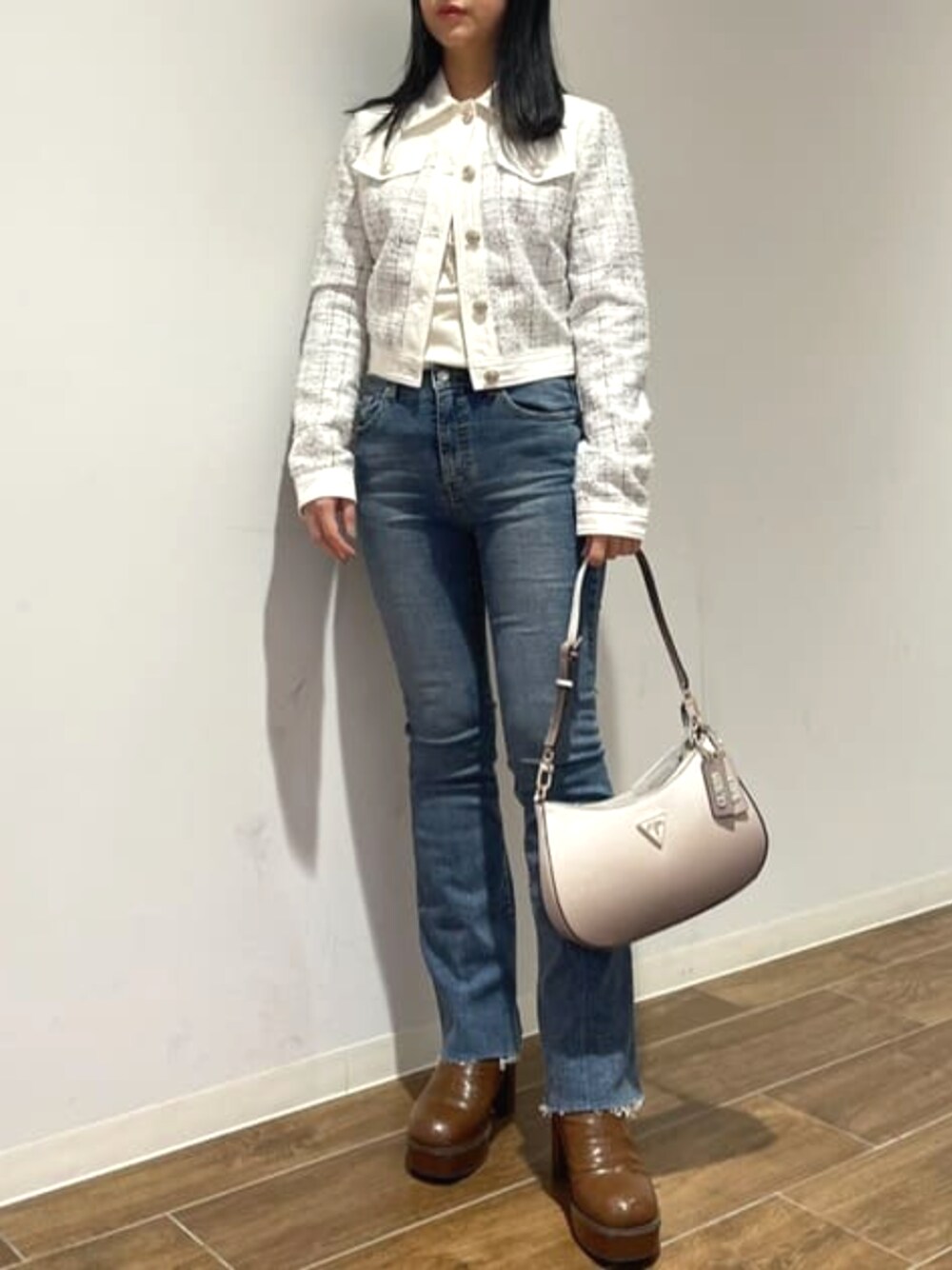 ドレッシーなジャケットをデニム合わせでカジュアルなコーディネートにしました。 ツイードジャケットなので春夏でも気軽に使えます。丈感がちょうど良いのでワンピースでもボトム類でも何でも合わせやすいアイテムです! カットオフのデニムはオールシーズン使いやすいカラーです。かなりストレッチもきいているので動きやすいのでオススメです! コーディネートの邪魔をしないシンプルなバックですがさりげないグラデーションカラーがポイントになります!