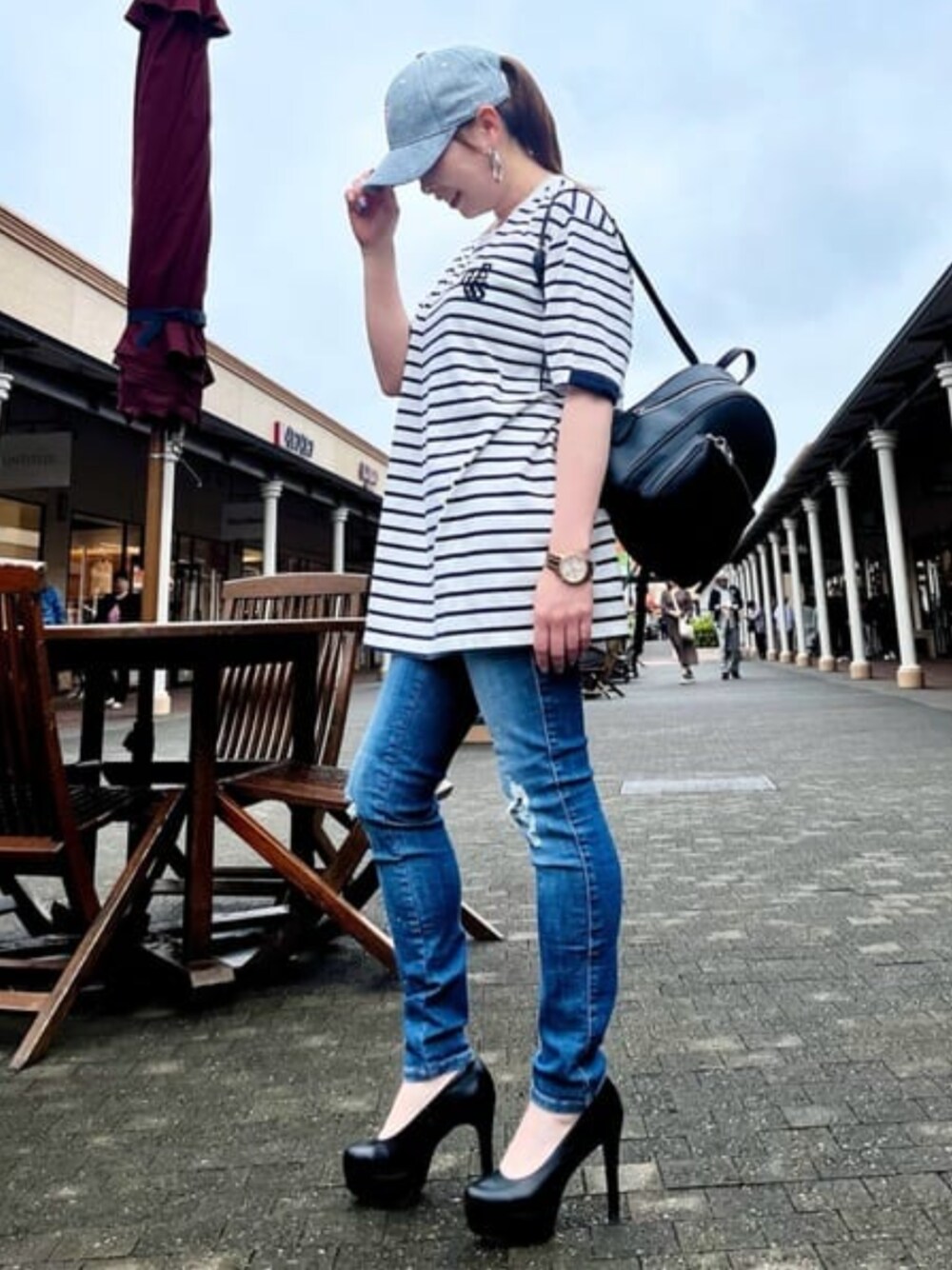 普段のカジュアルコーデです! ストライプTシャツとデニムのシルプルコーデなのでデニムはデザイン性のあるダメージ加工を選びました!