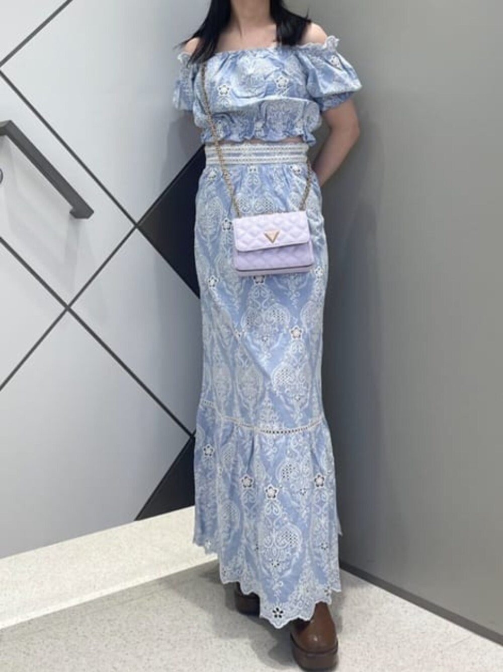 刺繍デザインがオシャレなセットアップはこれからのシーズンにオススメなブルーです。素材はコットンで柔からく、ドレッシーでありながらもカジュアルに普段使いもしやすいアイテムです! スカートはウエストが少し大きく感じたので、1枚目はピンですこしサイズを調整して着用することで広がりがなく細見えするのでオススメです。 そのままで着用するとふわっとしたシルエットで可愛らしい印象になるのと思います!