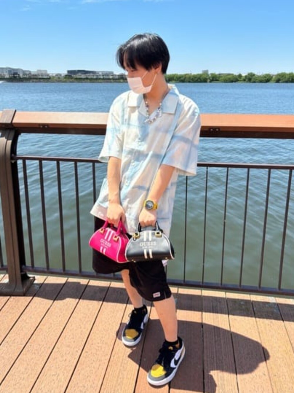 GUESSOriginalのitemを使ってコーデしてみました オーバーサイズのitemを使いBIGシルエットにすることでを見た目から涼しさup🔥 また、ミニバッグはショルダーにも出来るので便利なアイテムで3色あるので選び放題です