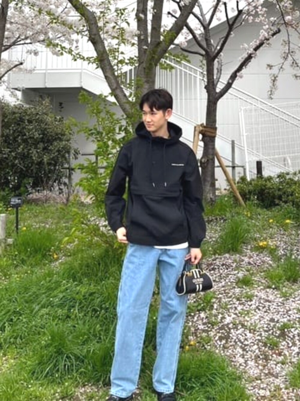 今回は、春のコーディネート! トップスとバッグを黒にして、ライトブルーのデニムで色味的に重たくなりすぎないように意識しました!トップスのアノラックフーディとカーペンターはオーバーサイズなので、ストリート感もあり、ストリート系のバッグも一緒に合わせるのがおすすめポイント!