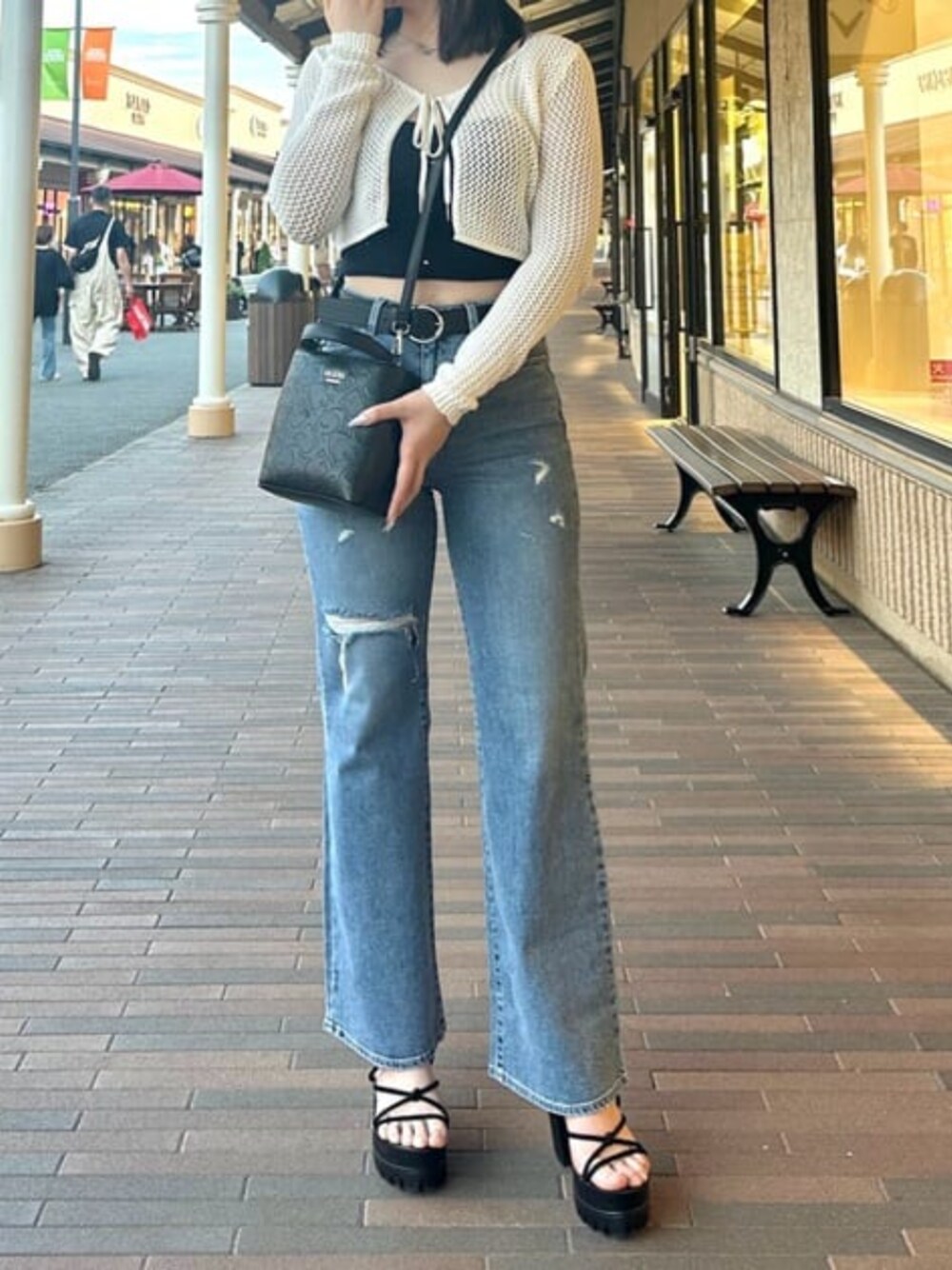 クロップド丈×ハイウェストデニム クロシェ編みのカーディガンはクロップド丈なのでウエスト位置を高く見せてくれます♪ デニムはさりげないダメージがこなれ感UP^^ bagはマチ幅が広く、中身が沢山入る収納力が魅力的⭐︎