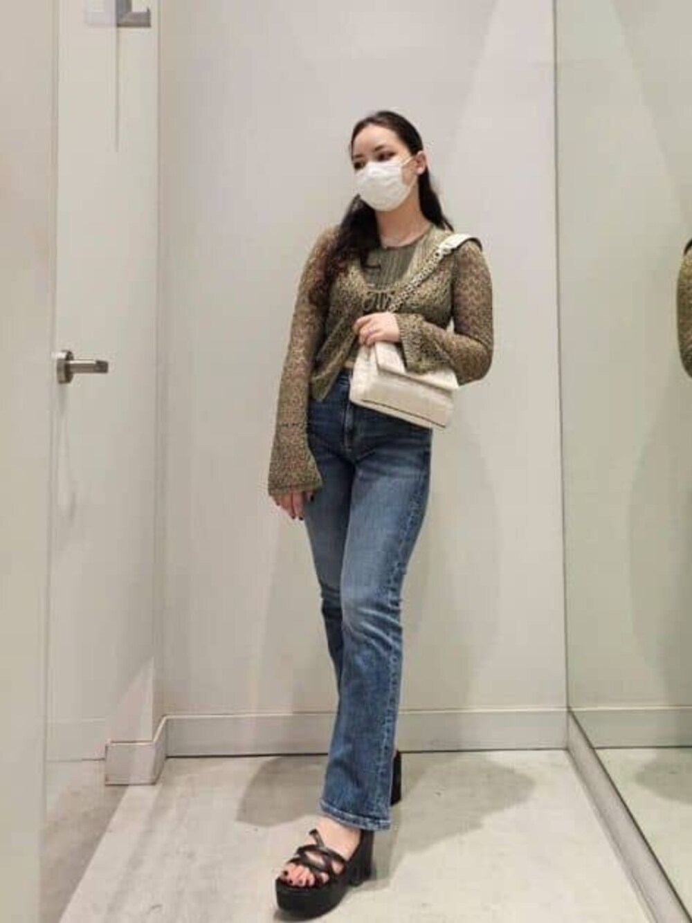 カーディガンキラキラで編み込みなので風通しがよくいつでも着やすいです! 中のタンクトップもGUESSロゴでキラキラしていてシンプルでデニムと合わせてもかわいい! デニムはブーツカットで少しストレッチ効いてるので動きやすいです。ミッドライズより少し上ぐらいなので丈が少し短いトップスと合わせても大丈夫です。 ハンドバッグは2way で斜め掛けもできます。 大きめなので荷物少し多い方にもオススメです。