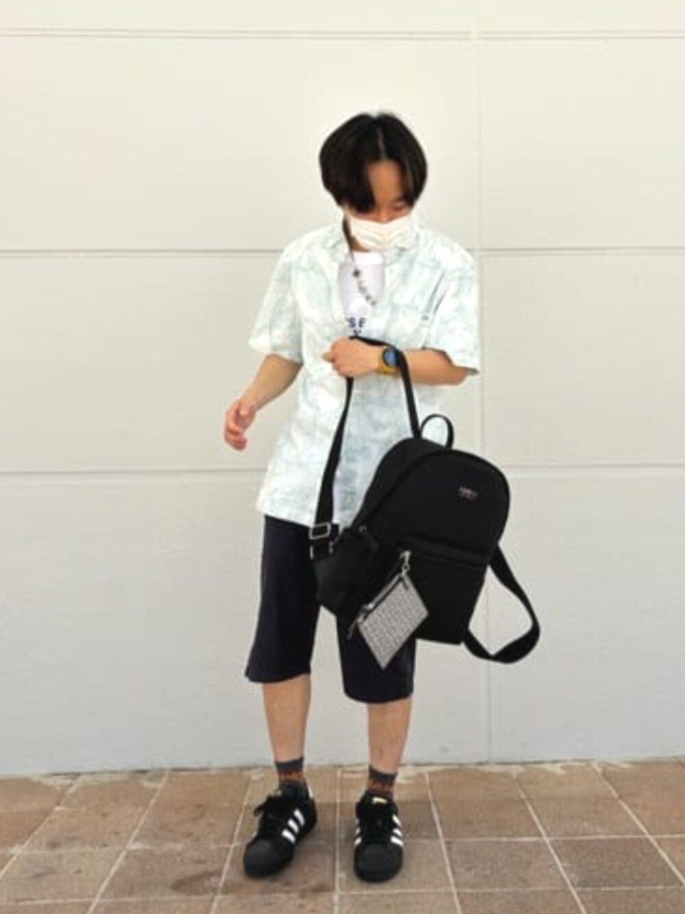 柄シャツを使って夏コーデ! 柄シャツはシンプルなデザインなのでかっこよく着こなしたり大きめのサイズで着るとストリートにも大変身! 合わせ自由で便利なアイテムです! Tシャツは真ん中ロゴなのでどのアイテムとも相性良しです! リュックの素材は洗濯もできちゃう優れもの!! 一緒に海にも入れちゃう