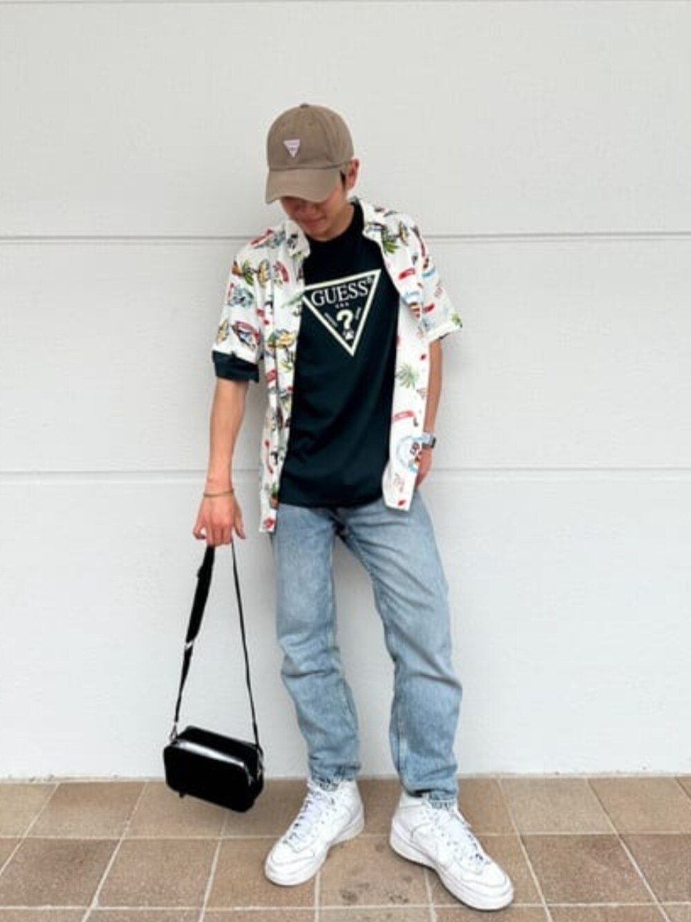 Guessのトレードマーク三角ロゴ 深めのグリーンとの配色が一際目立つデザインで普通の赤ロゴよりもオシャレ♪ 柄シャツは夏のマストアイテム 1枚でもTシャツと合わせても◎ バッグは太めのベルトで小さめですが二口で小分けしやすく荷物が少ない人にオススメ!男女問わず使えるのもポイントです! デニムは丈がちょうど良く形も綺麗に履ける形になってます!写真には写ってないですがレザーパッチがデザイン性あるのが好きです!!
