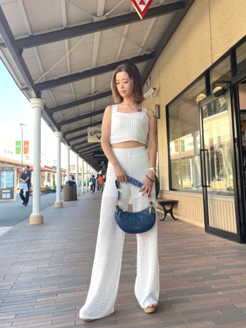 気温が高くなってきたので爽やかにホワイトのset upで(^^)☆ BAGは最近お気に入りのブルー♫ ハンドル部分にはブランドのロゴをあしらていてGUESSらしいアクセントですね。 キレイめ、スポーティー、どちらにも合わせやすいアイテムですよ!!