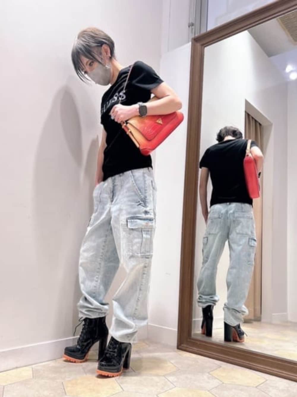 Tシャツに愛用のデニムでシンプルコーデ! オレンジのハンドバッグをワンポイントに サマーコーデに!! ショートパンツにかえても可愛いです♡