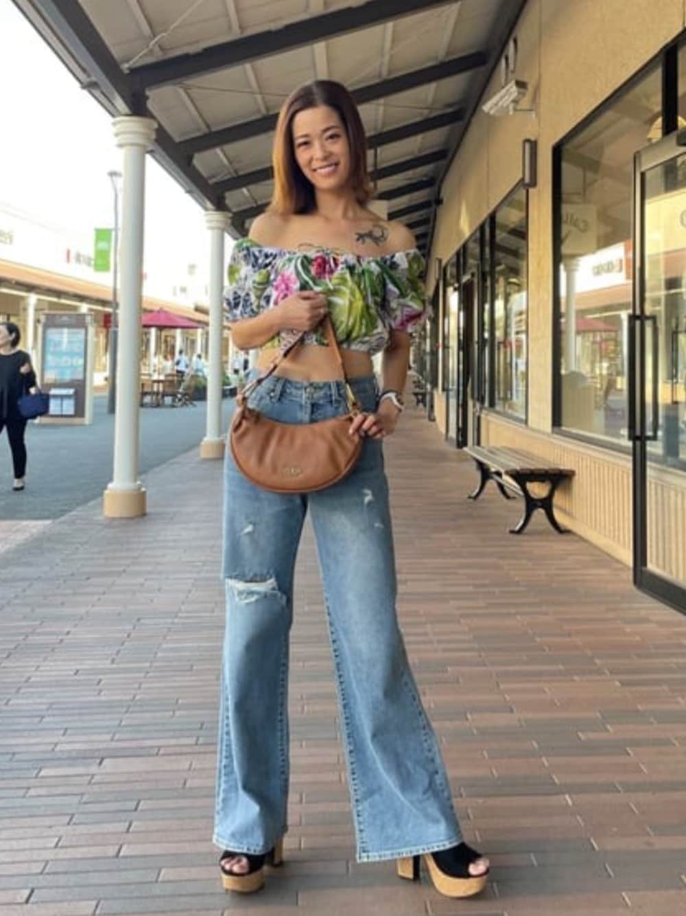 トップスは夏らしくボタニカル柄をチョイス☆! ハイウェストデニムとの相性抜群です(^_^) バッグは大人っぽく品のあるブラウンで合わせてみました♫
