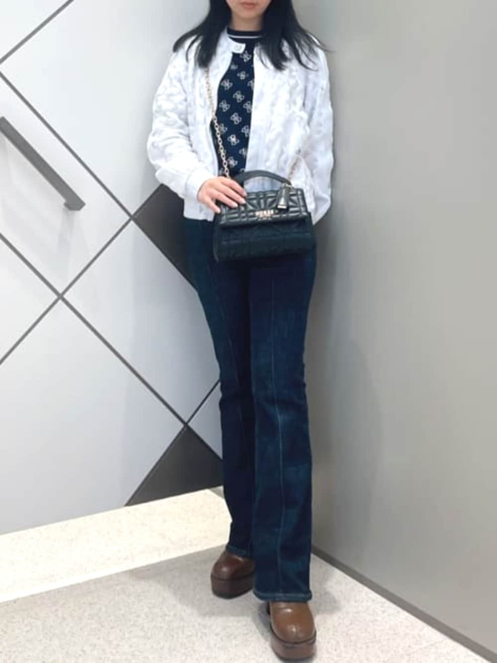 全体にストーンでロゴがデザインされていて動く度にキラっとしてみえるオシャレなトップスは伸縮性もあり着心地も抜群です。1枚でもインナーとしてでもオススメなアイテムです。 デニムもストレッチが効いていて履きやすい素材で、センターラインが入る事で脚長効果も有ります! アウターはホワイトで差し色に。カジュアルなシルエットですがレースがあしらわれているのでキレイめなコーディネートにもオススメです! バックはハンドとショルダーどちらでも持つ事が出来て、シーズンレスな素材とデザインになっています!