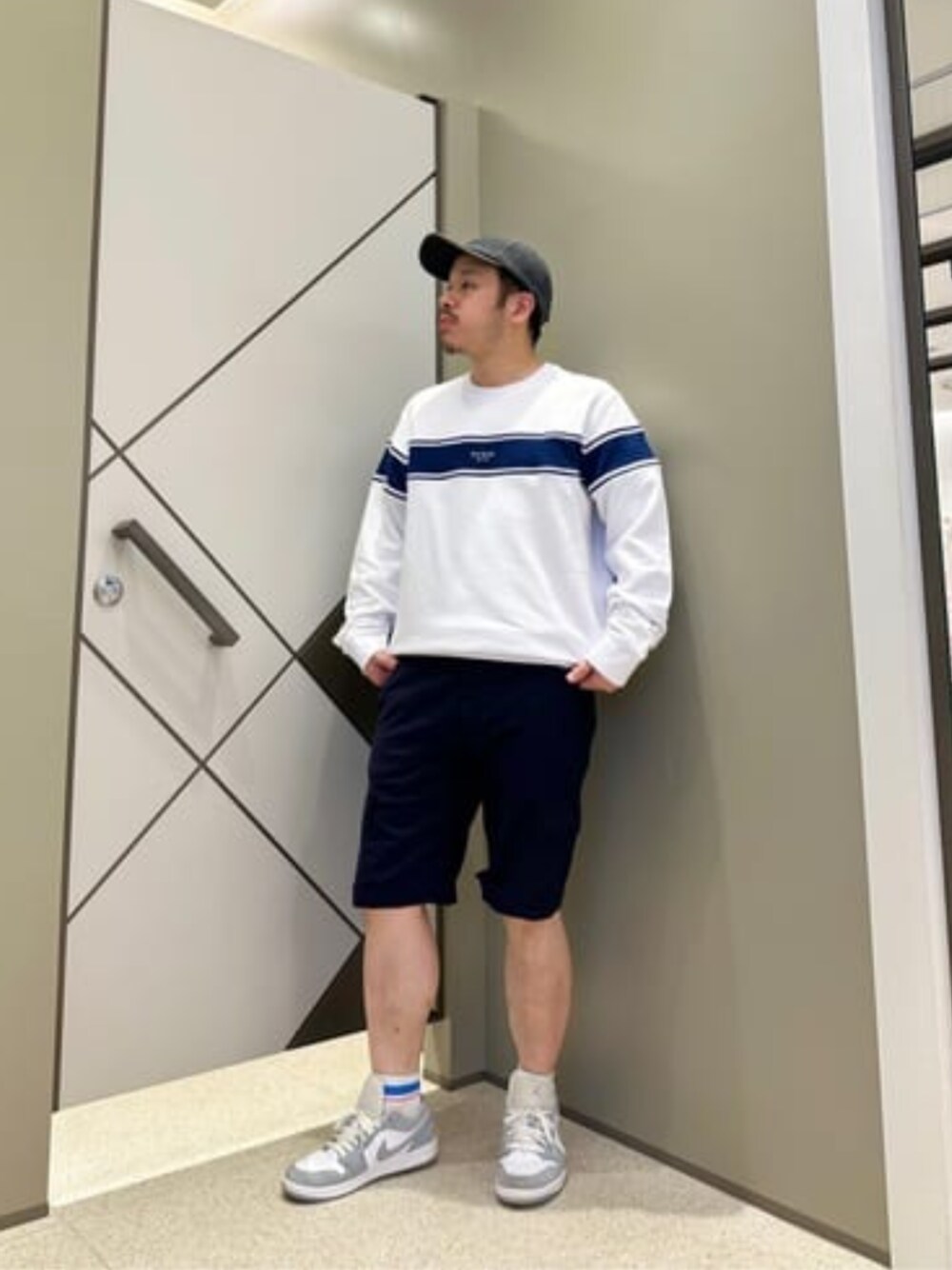外は暑いですが、室内のエアコンが寒くて 凍える時ないですか? 薄手のトレーナー1枚あるとそんな時でも安心です! シンプルかつロゴも小さいので合わせやすいですよ! ショートパンツはカーゴデザインですが、 太もも周りはスリムになっています! シャツ合わせでも◎