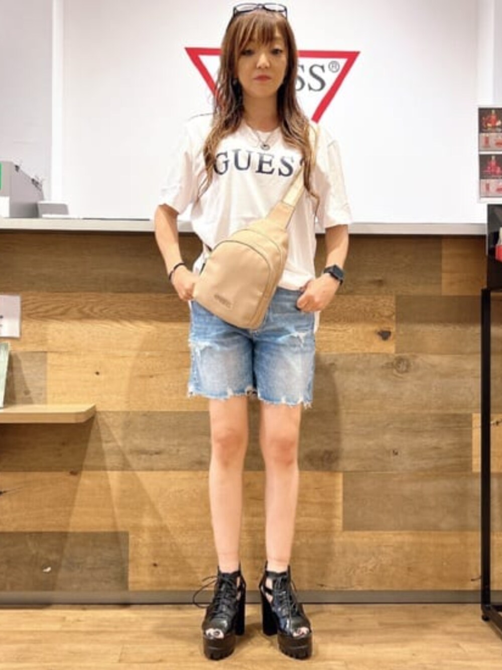 GUESSの大きめLOGOT-shirtsは オーバーサイズをチョイス( ´ ▽ ` )ノ 暑い毎日には youngみたいにショーパンを履きたい Masamiです( ˙-˙ )౨ ナイロンのBODYBAGはやっぱり とっても軽くて合わせやすさ抜群です⸌⍤⃝⸍