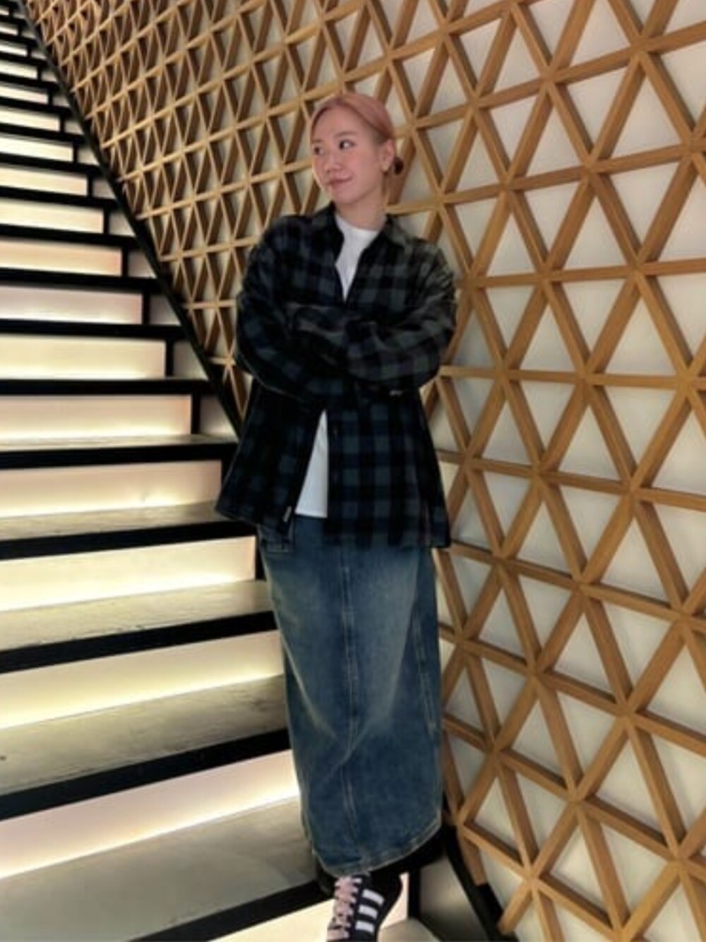 万能チェックシャツは他にない色が可愛い! 夏はシンプルなTシャツと肩や腰に巻いてワンポイント追加! お気に入りのデニムスカートは後ろスリットでシルエットが可愛くておすすめです♪