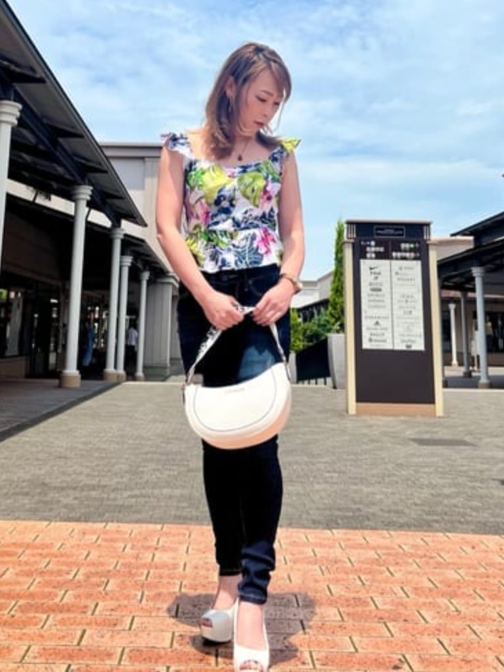 夏らしいボタニカル柄のノースリーブ! ウエスト部分がシェイプされて細見えします! BAGは白を選びました!ハンドル部分が太めベルトなので持ちやすく肩掛けしても安定感があります⭐︎とても使いやすいです♪
