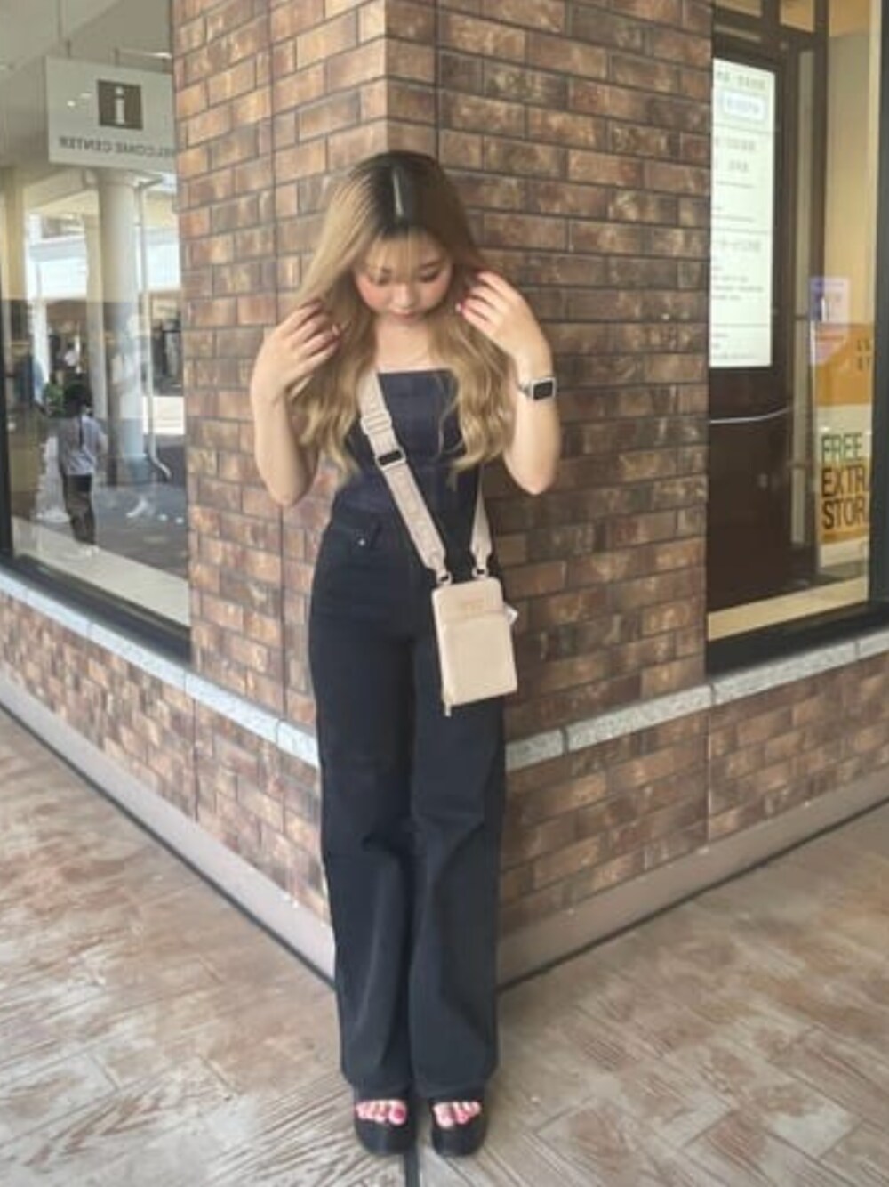 ハイウエストデニムになっていて美脚効果抜群○ トップスは後ろのチャックがデザインにもなって使いやすくて、便利です(^^) カバンの色味を変えるだけでブラックコーデでもワントーン明るく見えます!!