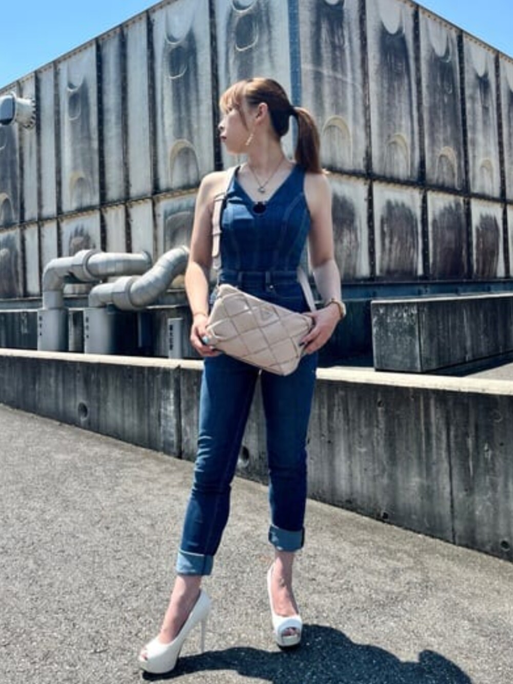 デニムジャンプスーツ⭐︎ ストレッチが効いていてとても動きやすいです!様々なインナーやアウターと合わせても◎ バッグは編み込みデザインが可愛くて素材も柔らかくとても使いやすい斜めがけバッグ! カジュアルでも綺麗めでも使えます(^^)