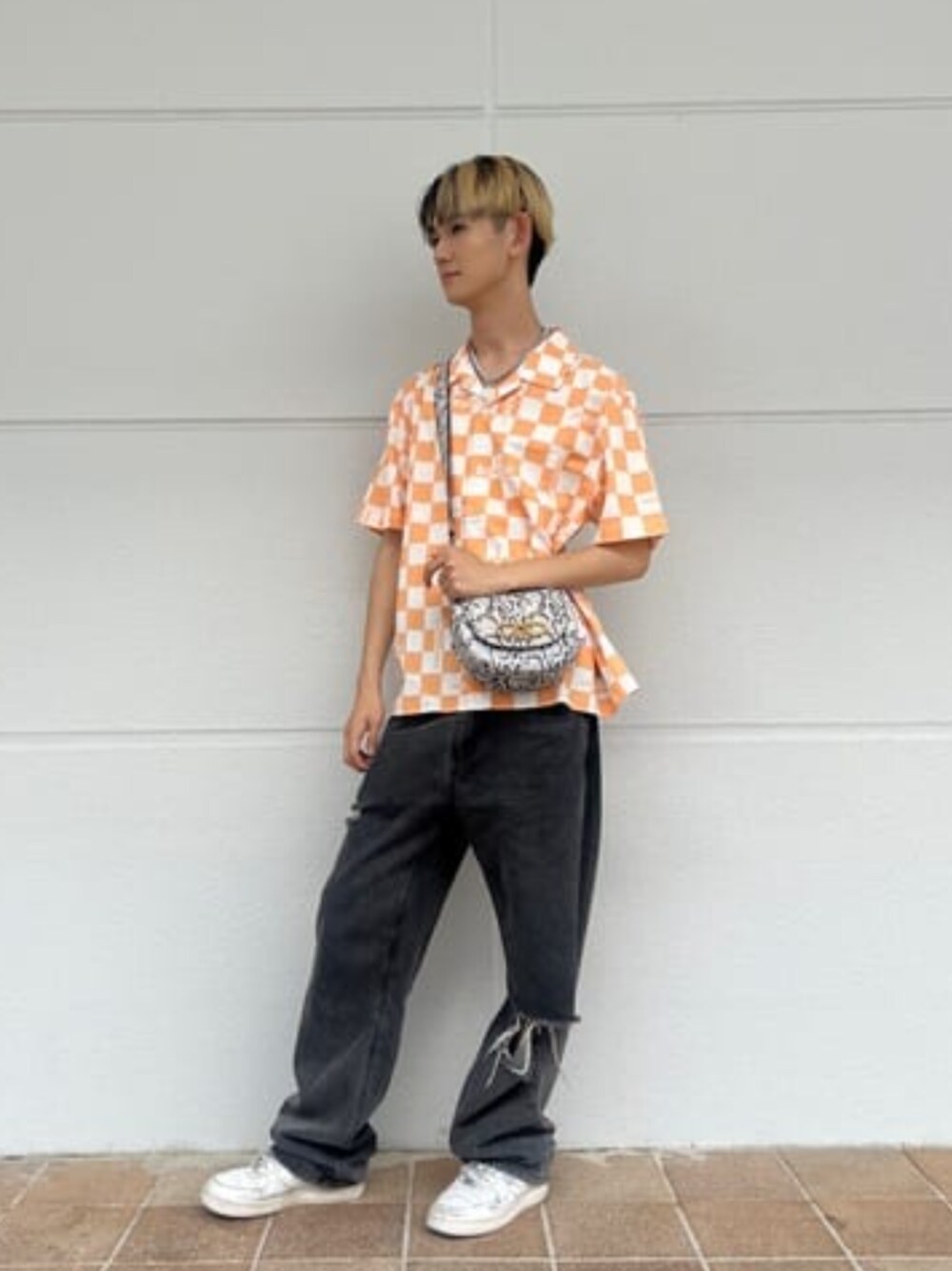 柄シャツコーデ🌞 明るい柄シャツにバッグも蛇柄の丸型のショルダーバッグでお出かけに最適なものを合わせました!ボトムスは、ストリート感のでるダメージのワイドデニムを合わせて今っぽいコーディネートにしてます!! ショルダーバッグは、ユニセックスで気軽に使いやすく、コーディネートのアクセントにもなると思うので、是非ご検討ください!😉