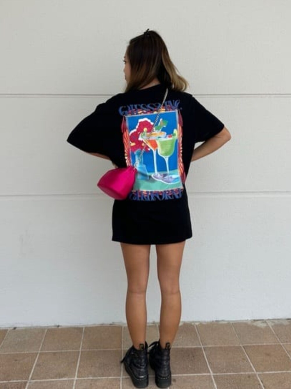 夏にぴったりバックプリントTシャツ♡ バックプリントは後ろ姿すらもおしゃれで釘付け 大きめルーズシルエットでワンピース風に着るのがみふ的大優勝🥇 黒とピンク🐦⬛🩷の組み合わせがだいすき!、 チェーンのバッグでアクセサリー風に💍 太陽の下でお酒呑みたくなる、そんなコーデ;)