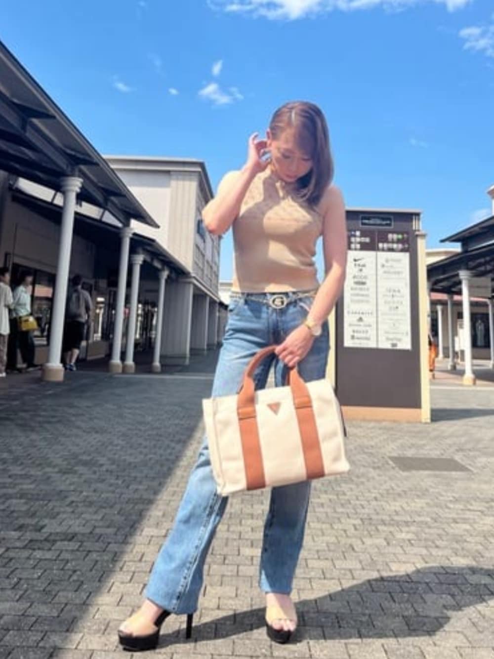オフィスカジュアルに⭐︎ ハイネックのノンスリーブとストレートデニムは両方落ち着いたデザインでそれぞれ使い回し抜群! トートバッグは大容量でお仕事にピッタリ!!キャンバス生地なので普段使いにも良いですよ(^^)