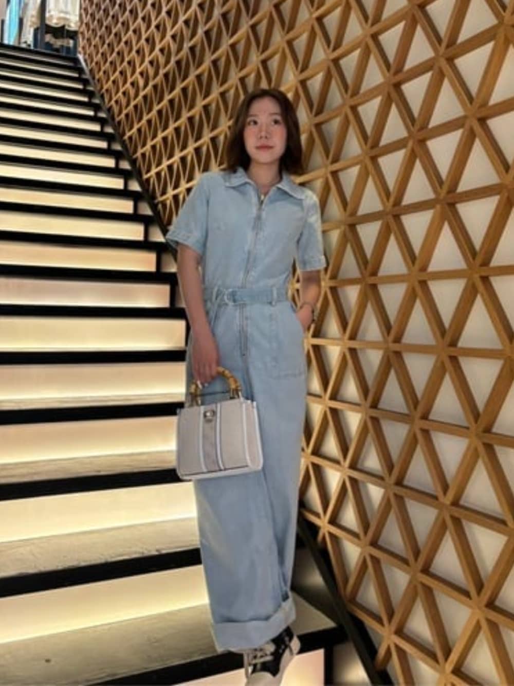 デニムロンパースは色が薄いので夏でも爽やかに着れます! スニーカーやヒールに合わせても可愛いです! バッグは持ち手がバンブーになっていてオシャレなんです♪