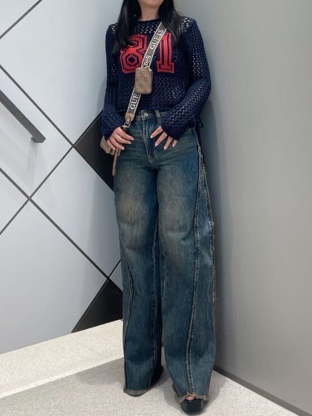 ざっくりとした編み目のニットは透けすぎず、サイドの紐を調節してシルエットに変化を出せます! デニムはフリンジお珍しいカットが人とは被らないデザイン。ストレッチはあまりきいていないですがバギーシルエットなのでゆったりとしたしたサイズ感です! ミニポーチ付きのバックはショルダーにロゴがプリントされていてコーディネートのアクセントにおすすめです!