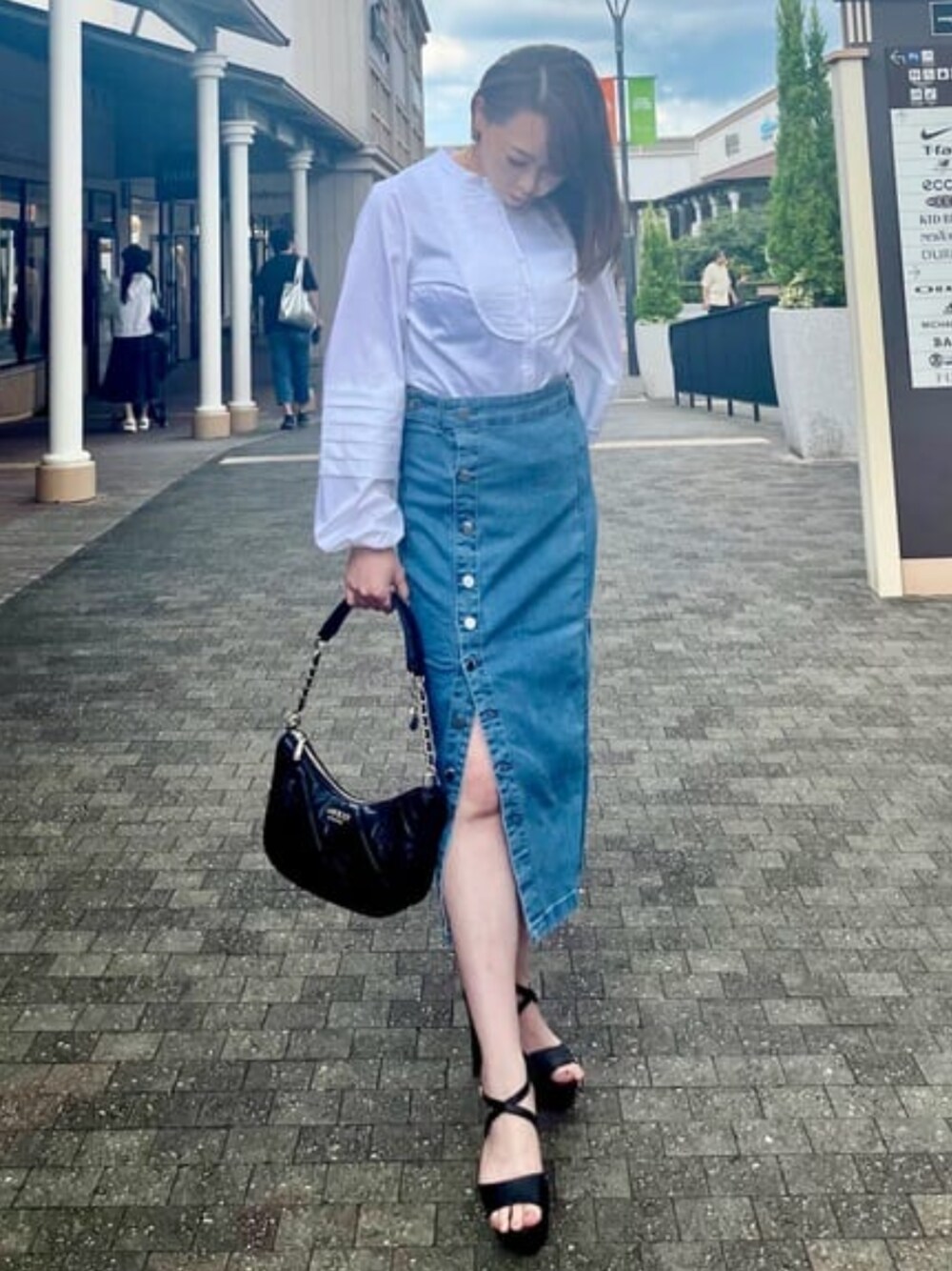 秋コーデ まだ暑い日があるので白地の爽やかシャツにスリットスカートで重くなりすぎない様にコーデしてみました。 バックは季節を問わず使えるデザインで生地も柔らかく使い易いです!! スカートはアウトレットのみ販売、気軽にご来店下さい☆