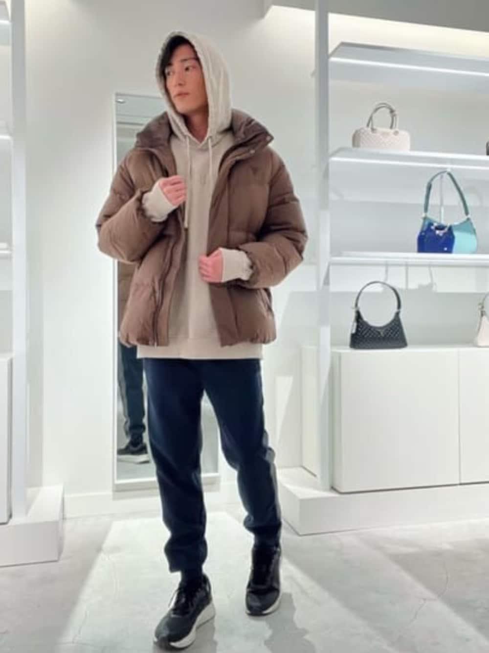 肌に優しい100%オーガニックコットンのオーバーサイズパーカーに「ダウン」の比率が高いプレミアムダウンジャケット、暖かさが十分に感じられ、芳しいカフェモカのような色、全体レトロなカラーのコーディネートでしっかりとした印象も、ゆるっとしたリラックス感も出してくれます。