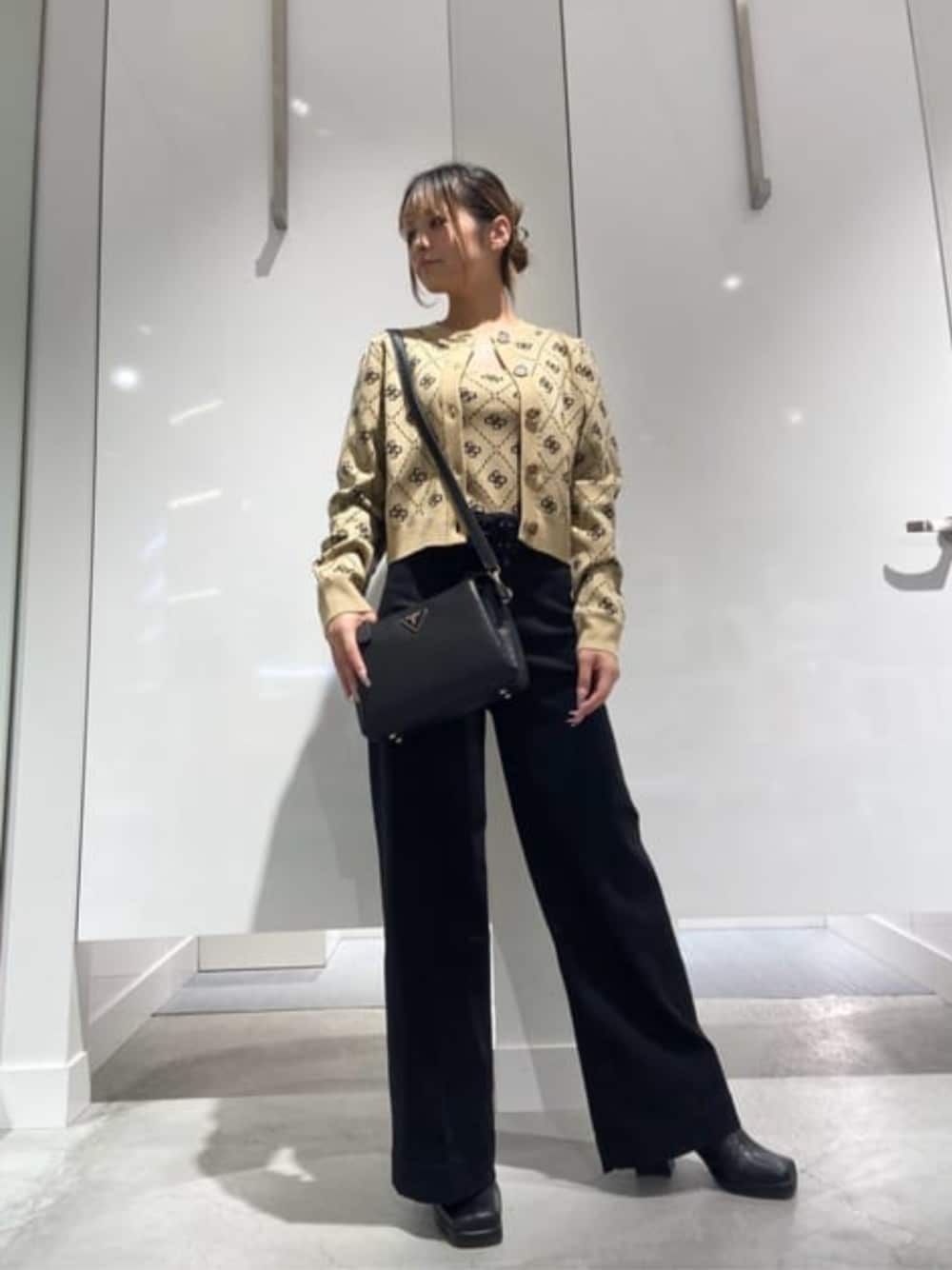 トップスはカーディガン×キャミソール! どちらもクワトロG柄のデザインになっていて可愛い!! 同じデザインのスカートと合わせるとセットアップコーデになります! デニムは伸縮性のあるワイドパンツ! 形が綺麗で履き心地が良いです!! そしてベルトが着いてます✨ バッグはショルダーバッグです! 長財布も余裕で入ります! 収納が多いのもおすすめポイントです