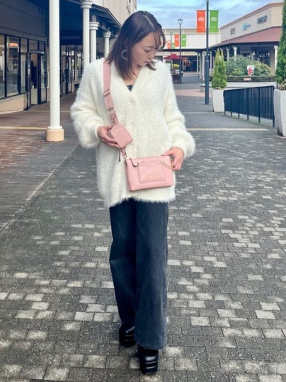 肌触りがいいふんわりカーデ! オーバーサイズなので可愛いくスタイルカバーもしてくれます♪ 今回はワイドパンツと合わせてのんびりラフスタイルにしてみました(^^) BAGはポーチ、カードケース付きの機能性ミニバッグ!