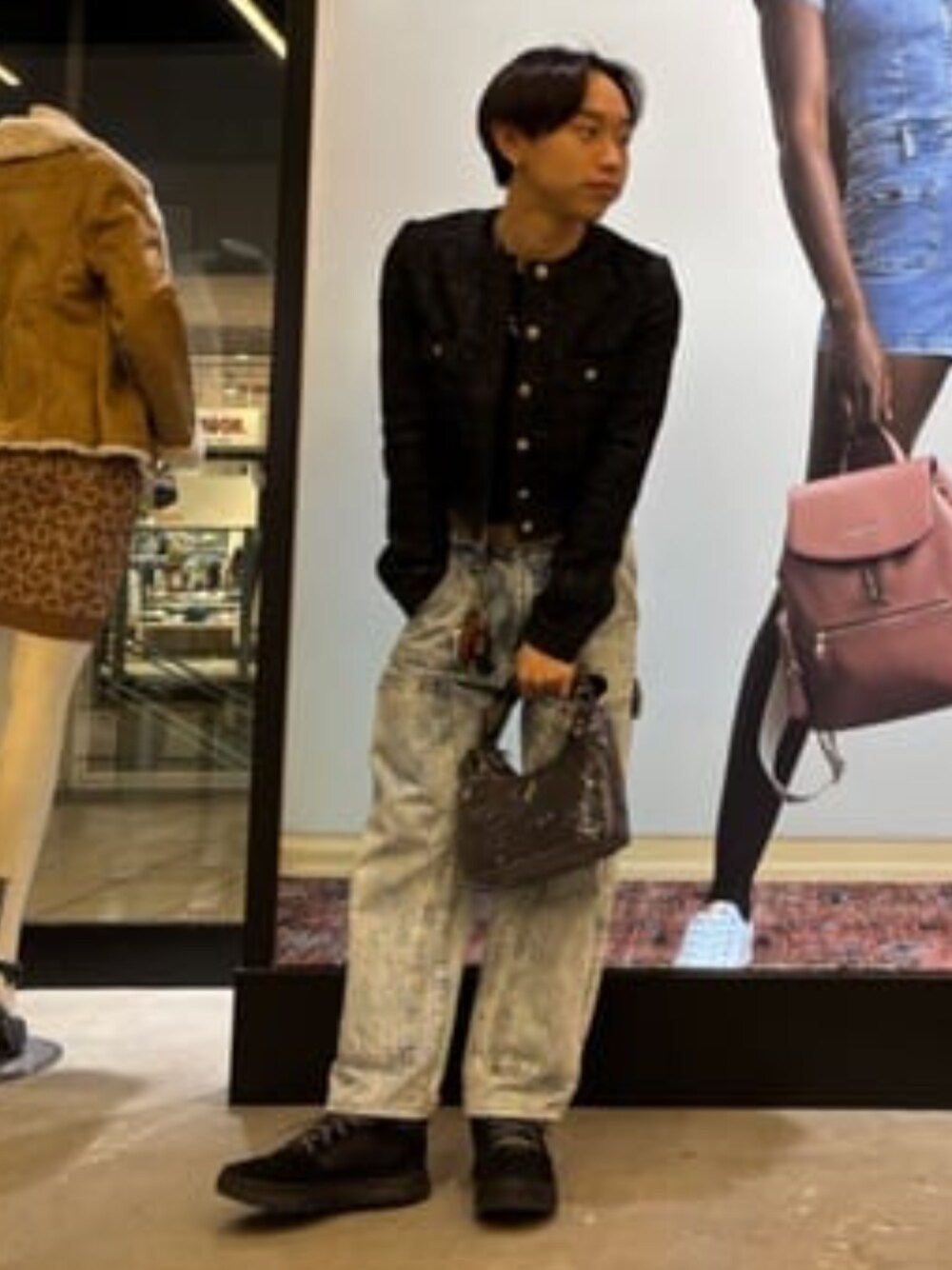 ジャケット🧥 レディースアイテムですがサイズ感はトレンド感あるクロップド丈なのでメンズが着ても外しitemとして使いやすいっ!! bagはキラキラが可愛いシルエットになっていて、 チェーン付なのでキレイめコーデの雰囲気にバッチリあいます!