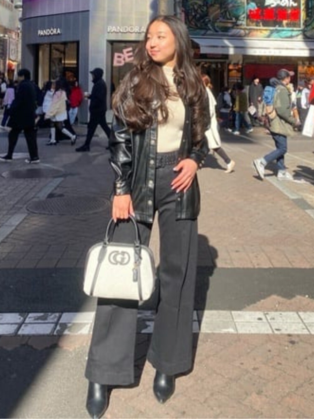 デートや友達とのお出かけにピッタリのコーデ! ジャケット:XS レザーだからカッコよく見える! トップス:XS いろんなボトムスに合わせやすい! デニム:26インチ 黒のデニムでかつワイドパンツだからスタイルアップにぴったりのデニム! バッグ ブラウンもあるよ!