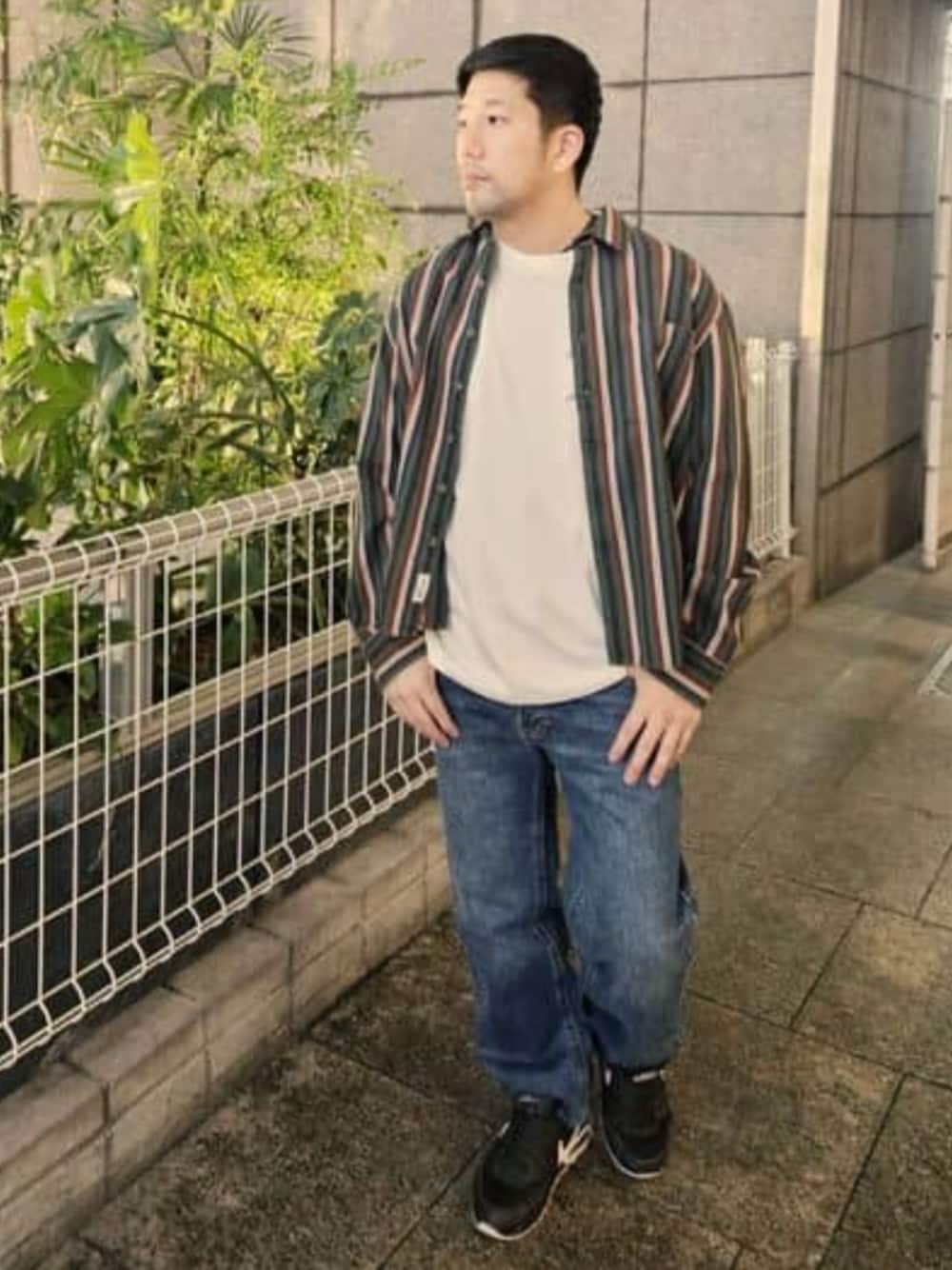 【GUESS ORIGINALS】 '90を思い出すストライプシャツは 丈が短めなのでインナーTシャツとの レイヤードがポイント!! デニムは【RELAXD】で ゆったりシルエットがトレンドです♪
