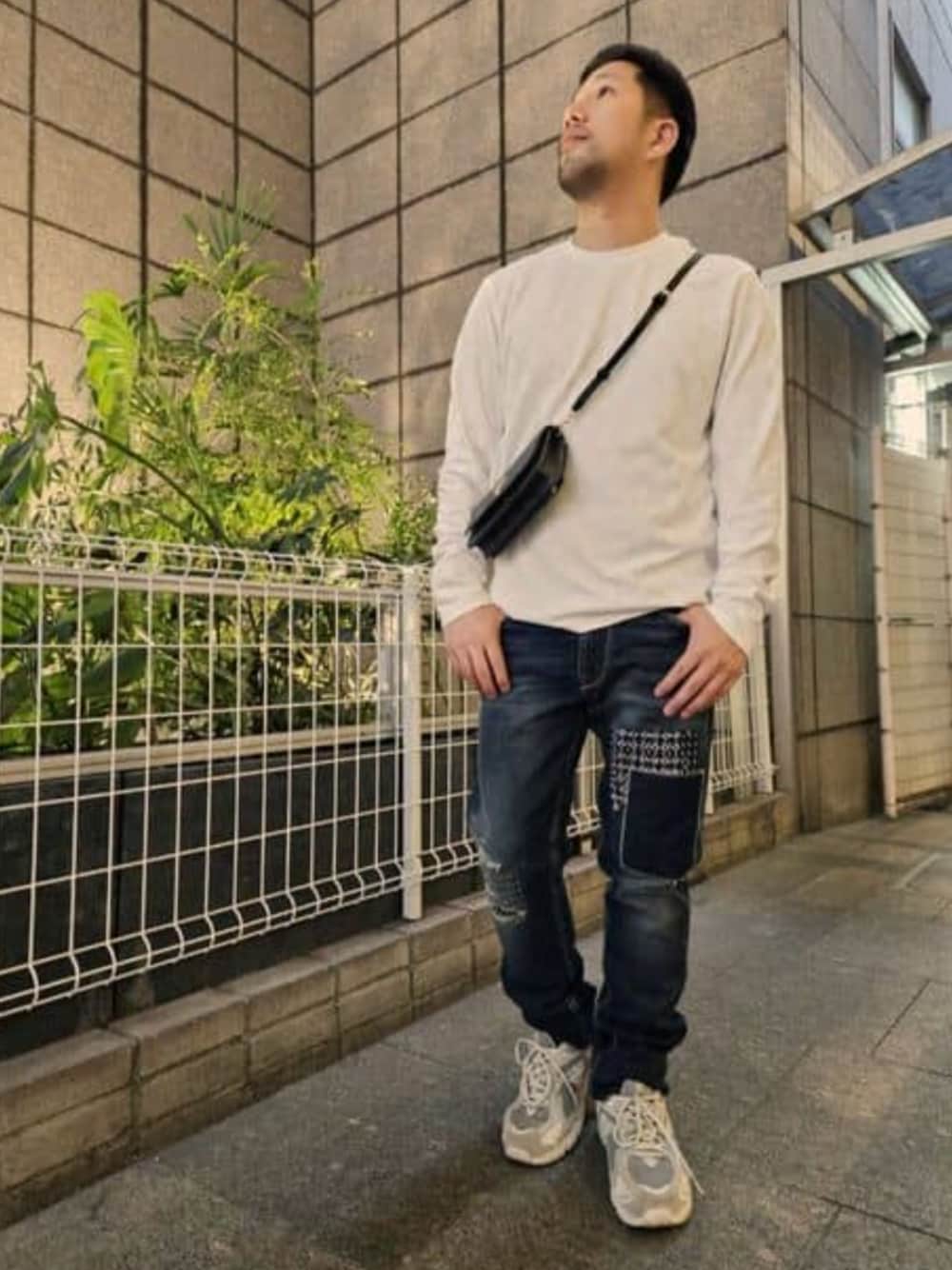 Spring ロンT Style!! GUESSの定番柄【クワトロG】の総柄 ロンTは同系色刺繍なので使いまわし抜群!! シンプルなロンTにはデザインが一際目立つ スリムテーパードデニムでオシャレ度UP!! ユニセックスで使えるウォレットバックで アクセサリー感覚で合わせましょう♪