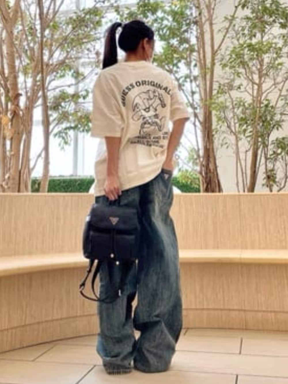 GUESS originalsコーデ♡♡ Topsはメンズのサイズ感ですがユニセックスの商品です!!! オーバーサイズでゆったり着るのがおすすめ⭐︎ カップルや友達とのお揃コーデにも♡♡♡ DENIMは私のお気に入りのBAGGYの形でカジュアルコーデにぴったり!!! フロントポケットの形や色味がポイント♡♡ こちらもオーバーサイズで腰履きで履いて頂くのがおすすめです◎ ショート丈のトップスを合わせるとY2Kコーデにも⭐︎ 大人気の型押しデザインのバックパックは中にもポケットが付いているので収納力◎ カジュアルなコーデにもぴったりですがストラップ部分がチェーンになっているので大人っぽいコーデにもお使い頂けます♡♡ 着用サイズ Tops M size Denim 25 inch