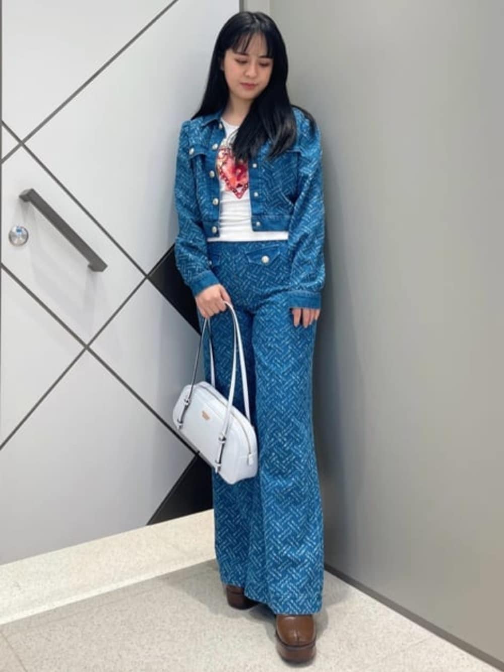 柔らかく着心地の良い素材のデニムセットアップ 厚手ではないので長いシーズン使えそうです♪ ジャケットはウエストあたりの丈感でワンピースなどの羽織としても使いやすいです! デニムパンツは高めなウエスト位置と膝下からの広がりで美シルエットに見せてくれます♪ Tシャツはフィット感のある素材ですがストレッチが効いていてノンストレスで着れそうです。GUESSのロゴと花のプリントやストーン付きで他にはないデザインがおすすめです♪