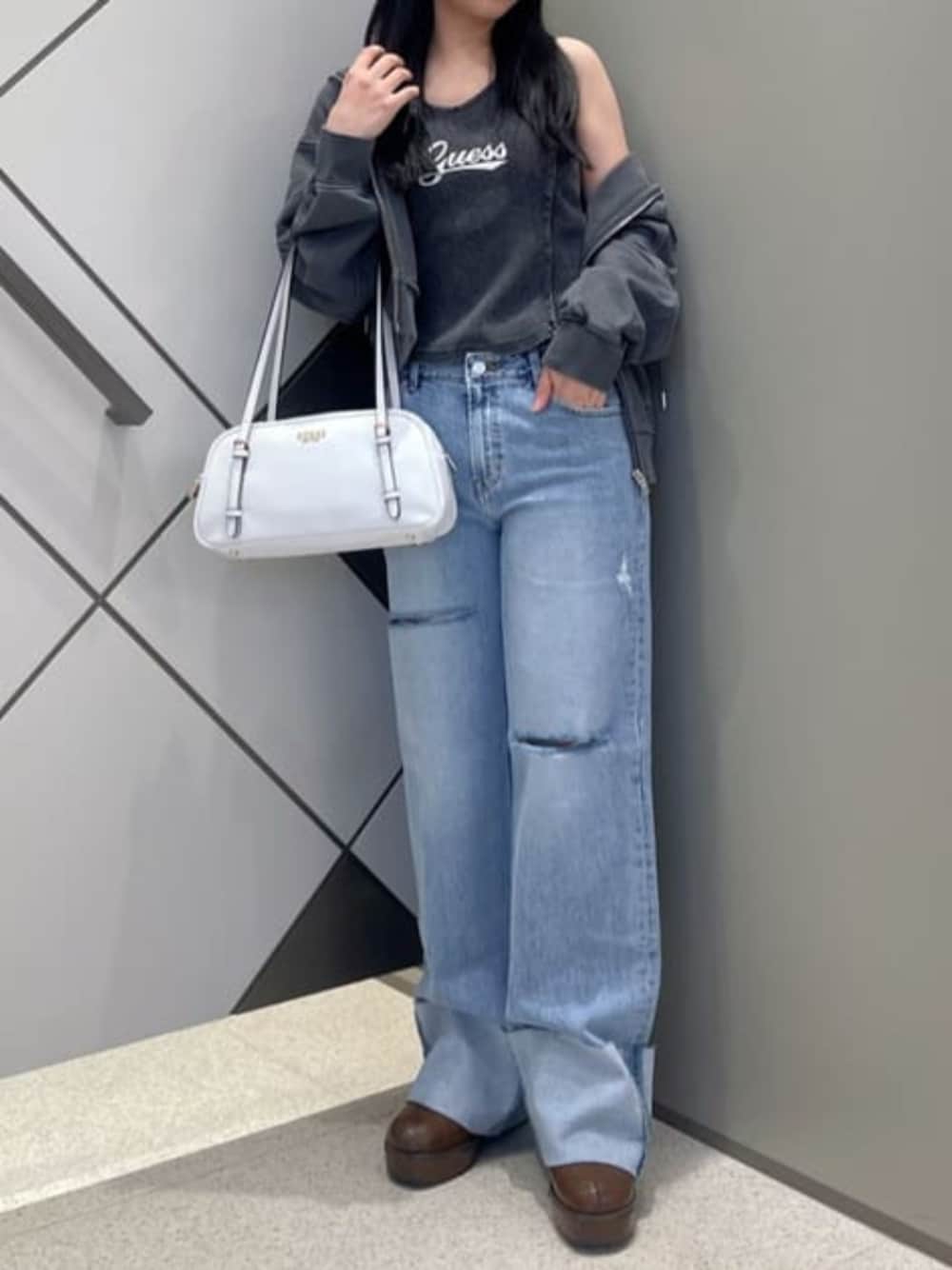 GUESS×NMIXXアイテムのコーディネートです☺︎ ヴィンテージ感のあるカラーのパーカーは ファスナーを全部閉めでも羽織でもかわいい♪ ほどよいダメージの入ったデニムと デコルテが見えるVネックのリブタンクで抜け感をプラスしおしゃれ感アップです! ハンドバッグは今年トレンドなデザインです!ハンドルが長めで肩にかけやすく、収納力もあるのでいろんなシーンで使えるバックです♪